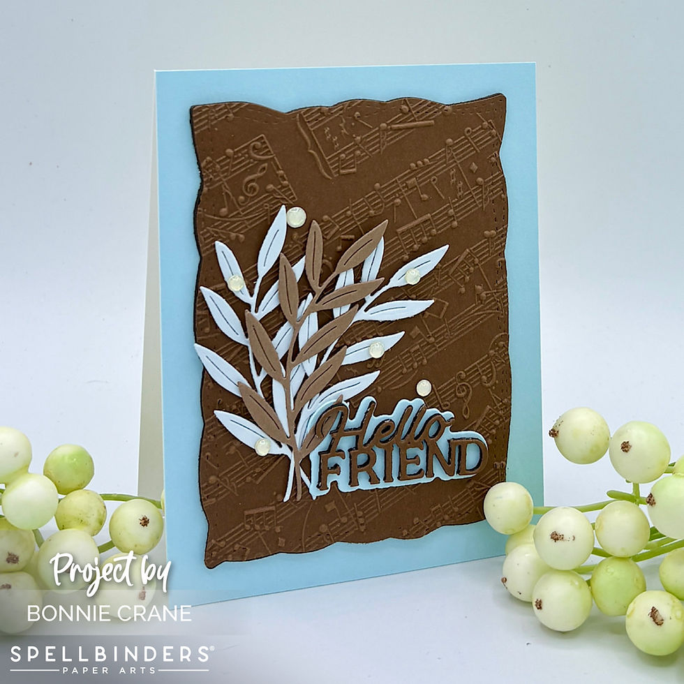 For the sentiment, I used one of the smaller Playful Stitched Panel dies from Fog and foam cardstock to create a tag, then wrapped it with silver embroidery thread for a soft, elegant touch. The “Hello Friend” sentiment from the Layered Hello Friend set was cut from Blush cardstock and white sheet foam, stacked, and adhered to the tag. The tag was then placed at an angle over the stems using foam squares.