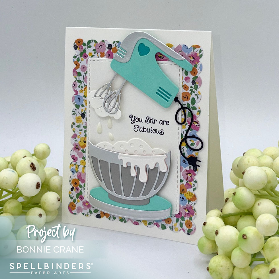 A simple colour palette from Colorwheel Cardstock was used to die cut the mixer, bowl, and stand—Teal Topaz, Blue, Spruce, and Anchor, with White and matte silver accents. Both the mixer and bowl were popped up with foam squares for added dimension, and Simply White Nuvo Crystal Drops were added to create the drips coming off the mixer attachments, enhancing the fun, freshly-mixed look. The card was finished with a sweet stamped sentiment, “You Stir Are Fabulous,” from the Sugared Expressions stamp set included in this collection.
