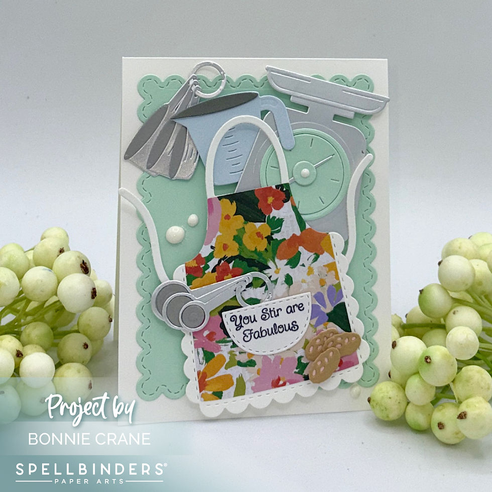 The final card features the Measure Mates die set—everything you need to bake the perfect creation. I couldn’t resist including that adorable bib apron from Made With Love cut from patterned paper from from the Breakfast in Bed 6” × 6” Designer Paper Pad, which adds such a charming focal point to the design. The background for this card was cut from Mint cardstock using the scalloped die from the Bow and Bell Scallop Frame die set.